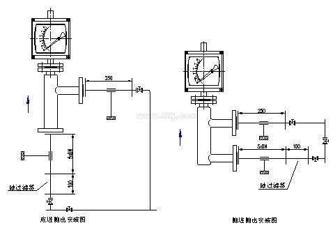 流量計垂直安裝,流量計中心線與鉛垂線的夾角不超過5°,在流量計的上游須保證五倍公稱通徑的入口直管段,下游保證250mm出口直管段。如果介質中含有固體雜質,應在流量計上游加裝過濾器;如果介質中含有鐵磁性物質,應在流量計的上游安裝磁過濾器。為了便于維護和清洗且不影響生產,建議安裝旁通管路。為了避免由于管道引起的流量計變形,安裝法蘭必須與儀表同軸并且相互平行,并適當地支撐管道以避免管道振動和減小流量計的軸向負荷,測量系統中控制閥應安裝在流量計的下游。用于測量氣體時,應保證管道壓力不小于5倍流量計的壓力損失,以使浮子穩定工作。